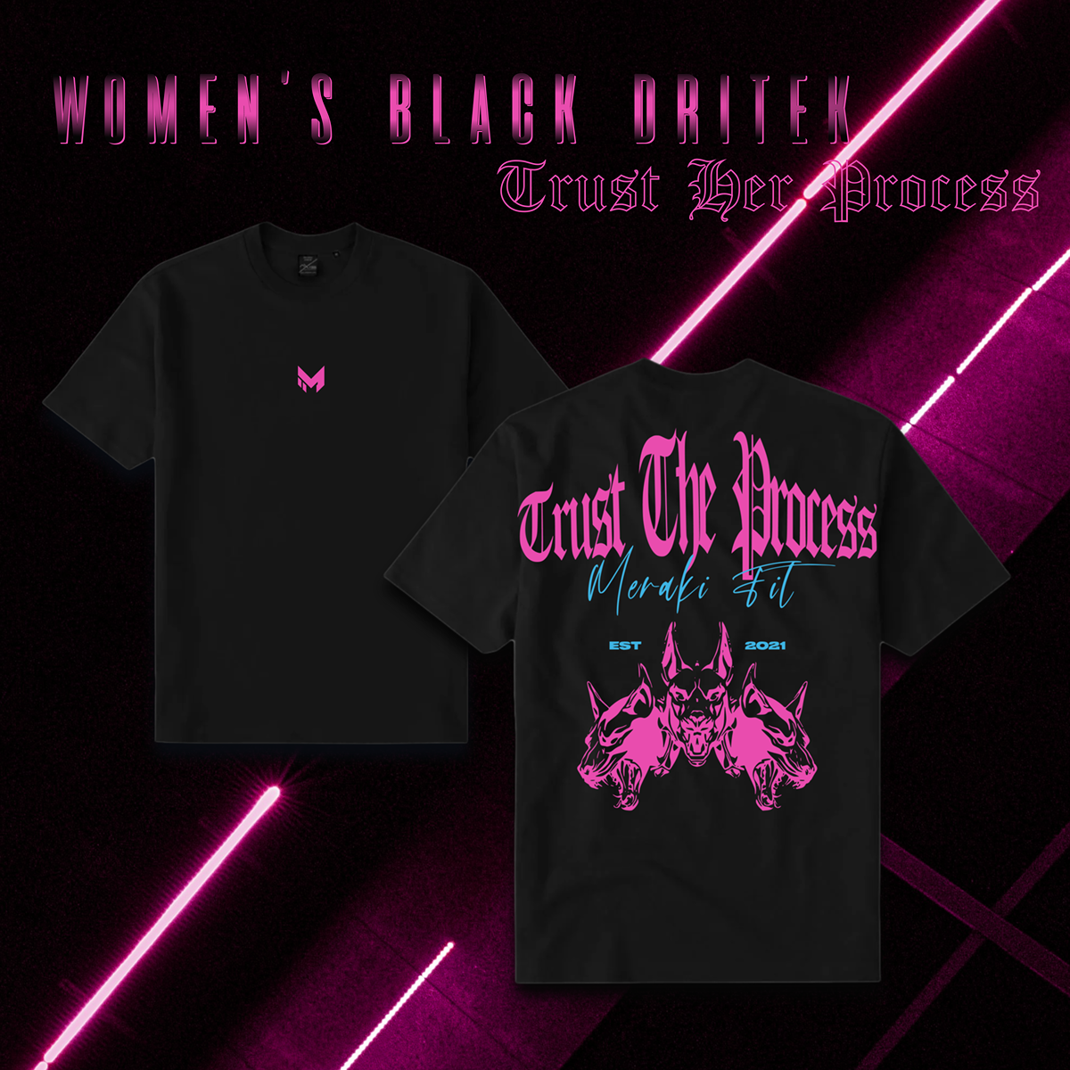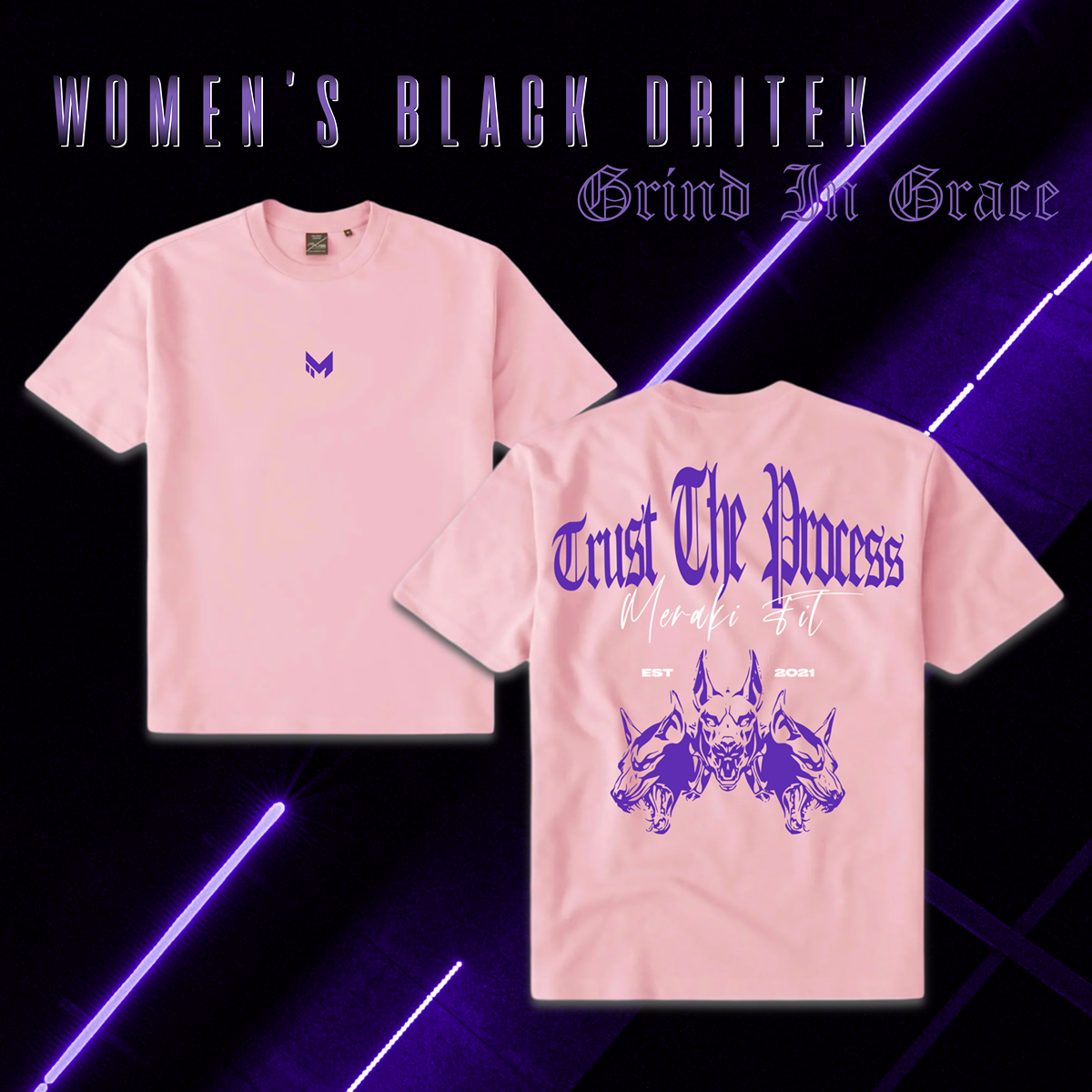 Minimal in tone, bold in purpose — the Gray Over Matter DRITEK Tee is built to perform in the gym and still turn heads in the street. Featuring a sleek navy "Trust The Process" back graphic, paired with Meraki Fit’s signature triple-canine design, this oversized drop-shoulder tee brings comfort, movement, and meaning together. Moisture-wicking DRITEK fabric keeps you cool while its sustainability story keeps it conscious.